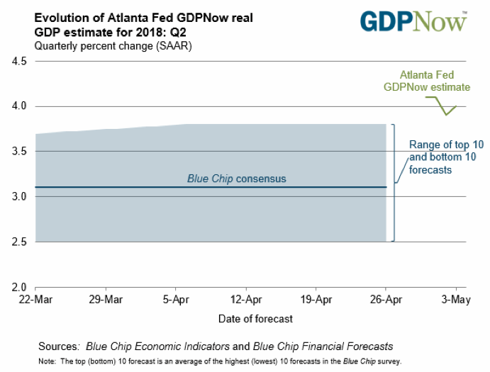 The Atlanta Fed at the outset of Q1 projected 5 percent annualized GDP growth in Q1. Turned out to be 2.3 percent. Its newest for Q2 begins with 4 percent growth: