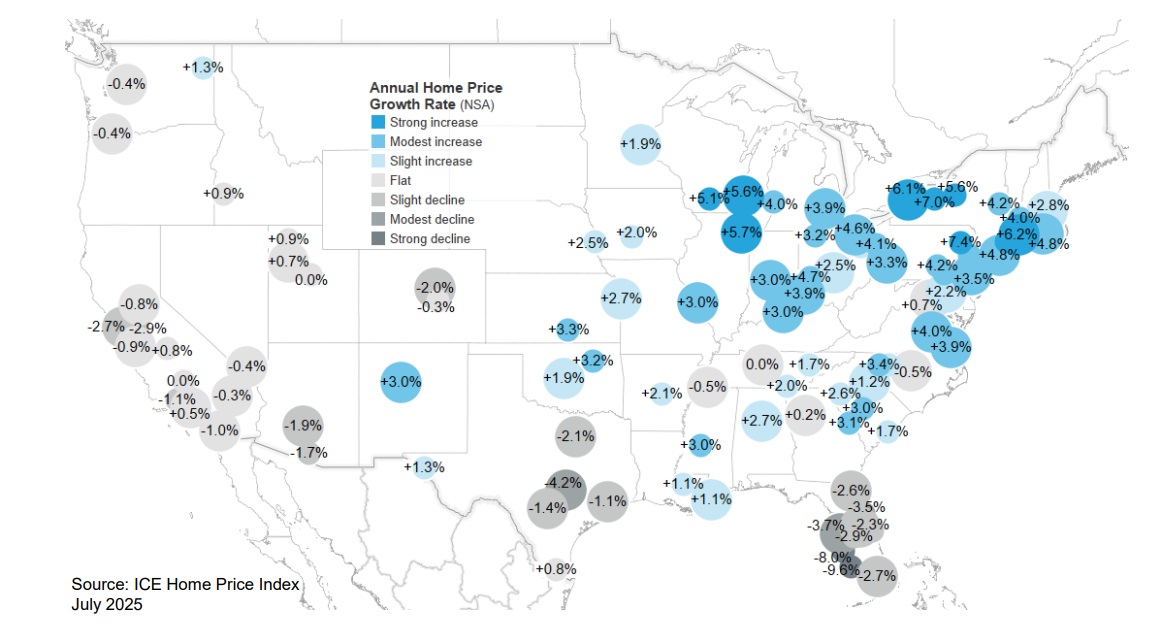 Seasonally adjusted price changes from local market post-pandemic peaks. Source: ICE Mortgage Monitor, August 2025.