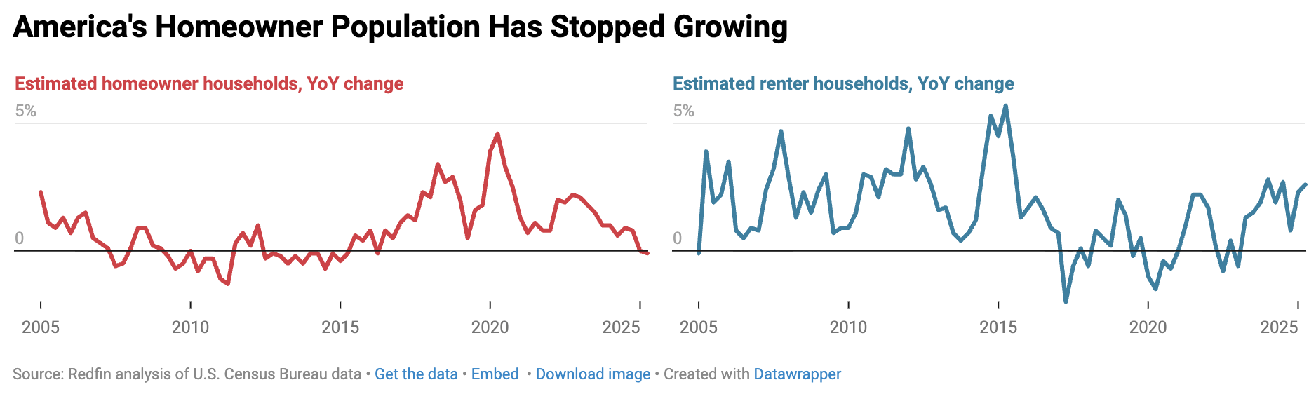 During the second quarter of 2025, the number of homeowner households in the U.S. dipped by 0.1 percent year over year to about 86.2 million households, according to a new Redfin analysis of U.S. Census Bureau data. The decline is slight, but significant, since it’s the first such decline in nearly a decade.