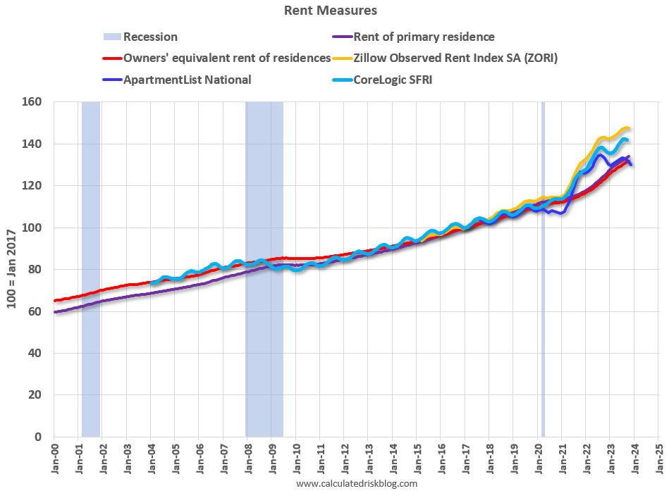 Here is a graph of several measures of rent since 2000: OER, rent of primary residence, Zillow Observed Rent Index (ZORI), ApartmentList.com and CoreLogic Single Family Rental Index (All set to 100 in January 2017)