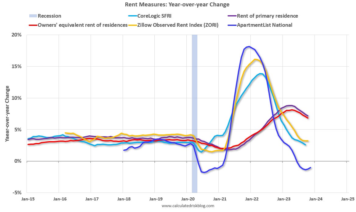 Here is a graph of the year-over-year (YoY) change for these measures since January 2015. Most of these measures are through October 2023, except CoreLogic is through September and Apartment List is through November 2023.
