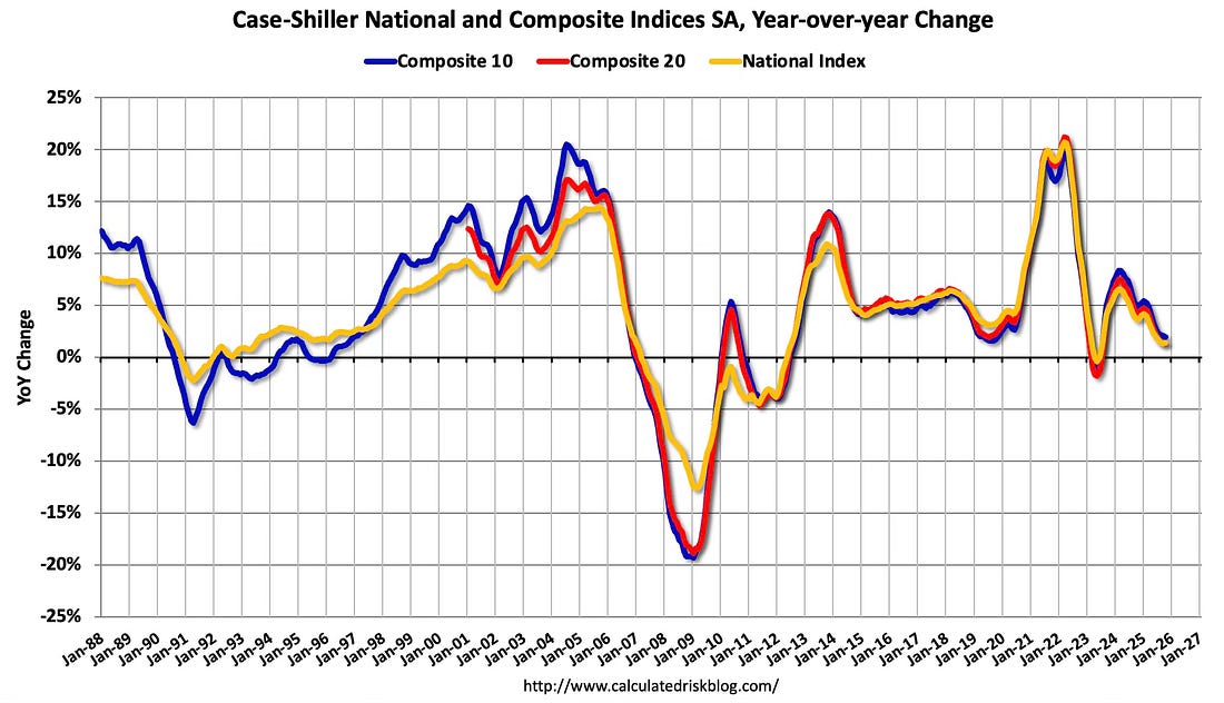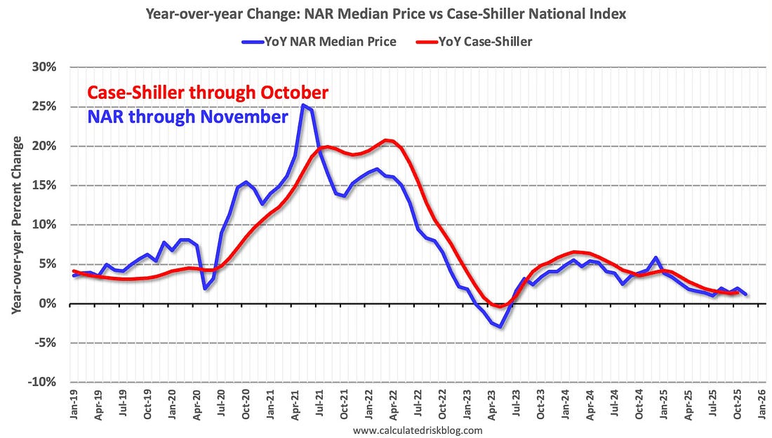 The median price was up 1.2% year-over-year in November, down from 2.0% YoY in October, andthe Case-Shiller National Index was up 1.4% year-over-year in the October report. This suggests the Case-Shiller index will likely be about the same year-over-year in the November report compared to October.