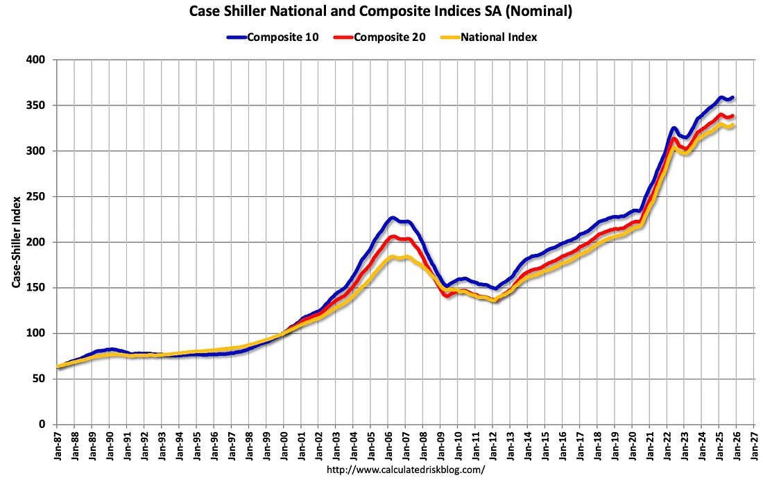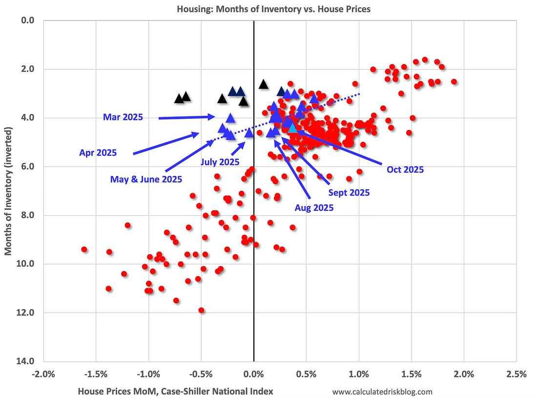 This graph below shows existing home months-of-supply, inverted, from the National Association of Realtors® (NAR) vs. the seasonally adjusted month-to-month price change in the Case-Shiller National Index (both since January 1999 through October 2025). Note that the months-of-supply is not seasonally adjusted.
