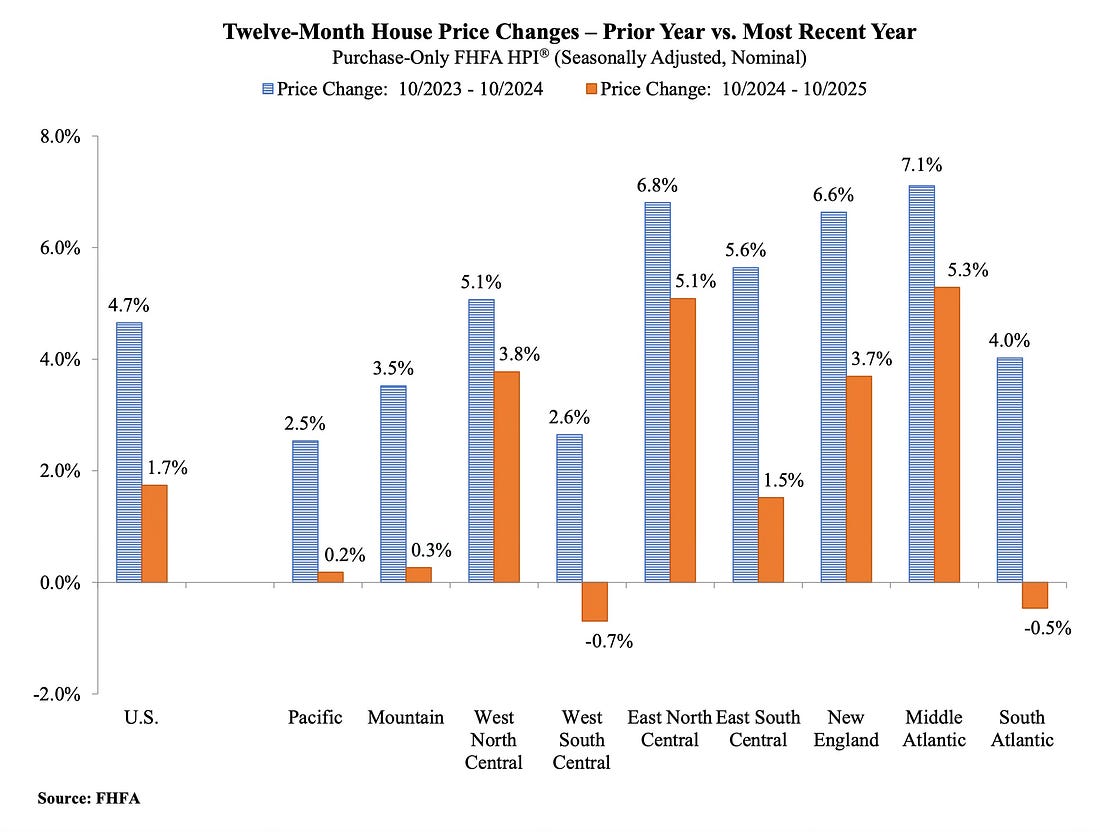 Here is a graph from the FHFA report comparing the annual change by region for October 2025 and 2024.