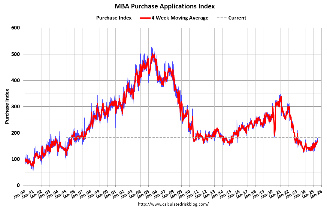 Here is a graph showing the MBA mortgage purchase index released last week. Purchase application activity is up from the lows in late October 2023 and is above the lowest levels during the housing bust.