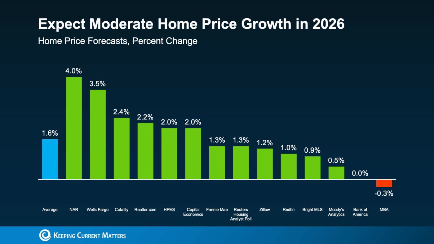 With more homes for sale, there isn’t as much upward pressure on prices right now. And we’ve seen that shake out over the past year. Even so, the overwhelming majority of experts say, nationally, prices will continue rising in the year ahead – just at a slower pace. On average, they say prices will rise by 1.6% in 2026 (see graph below):