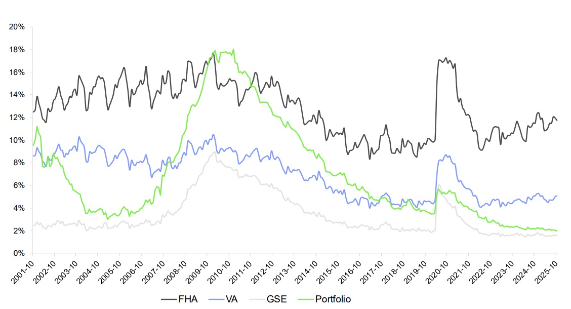 Mortgage delinquency rates by loan type. Source: ICE Mortgage Monitor, December 2025.
