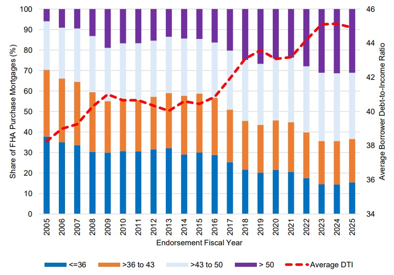 But thanks to rising home prices and mortgage rates, FHA borrower debt-to-income ratios have climbed from less than 40 percent during the 2005-2006 housing bubble to over 45 percent during the last three years.
