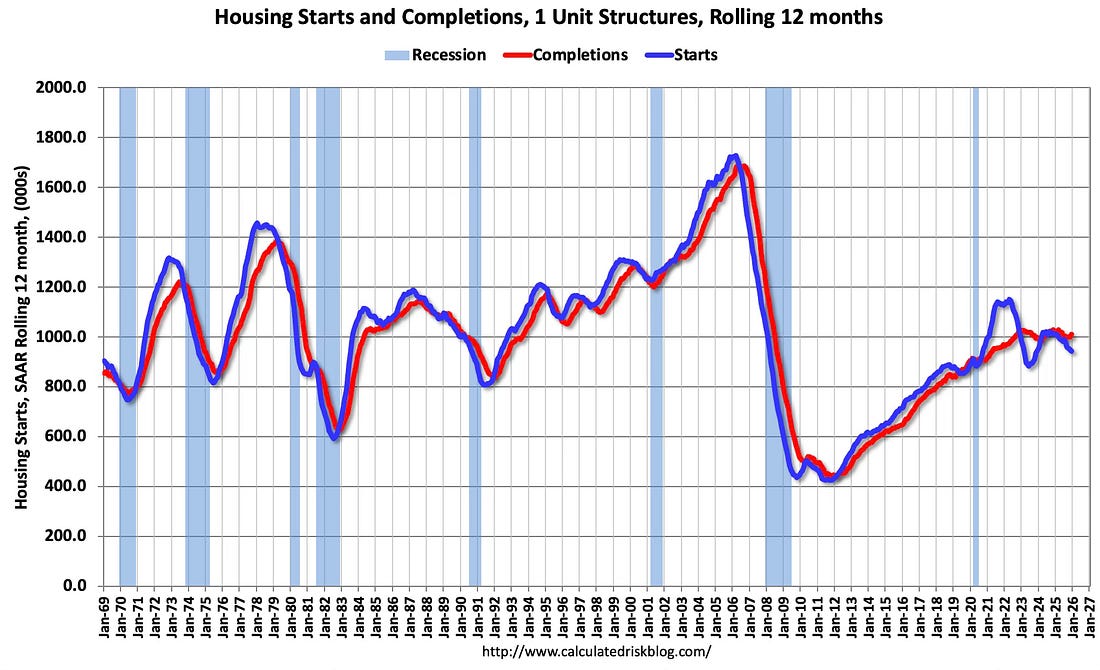 Demand weakened in 2025 and this held down single family starts last year. However, somewhat lower mortgage rates in 2026 will help.