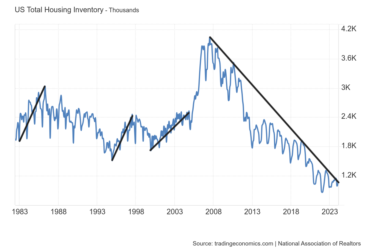 All of these factors set the stage for what happened next. As you can see in the chart below, when we entered 2020, housing inventory was already on the verge of breaking toward all-time lows. In 2022 we had the most significant home sales crash ever and even in 2024 we are in the third year of the lowest number of home sales ever — but inventory is still near all-time lows.
