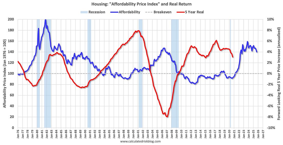 Here is a graph showing affordability, and the 5-year real return (red) on the house purchase (annualized). The 5-year real return is the future return on the Case-Shiller index, adjusted for inflation.