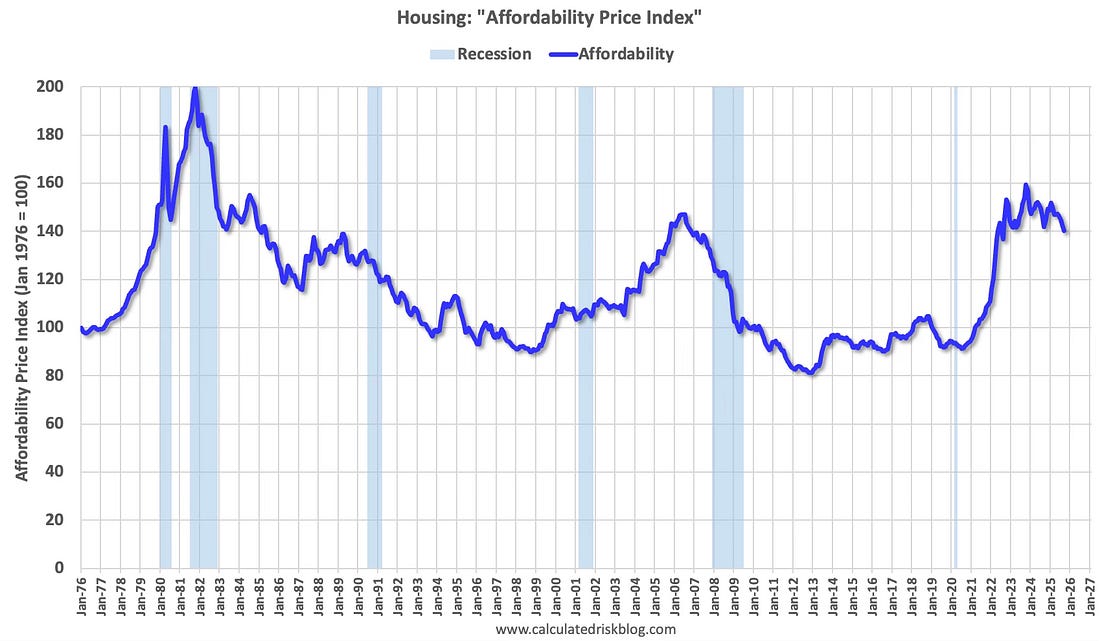 I’ve put together my own affordability index – since 1976 – that is similar to the FirstAm approach (more of a house price index adjusted by mortgage rates and the median household income).