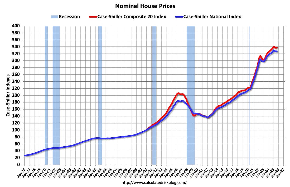 In nominal terms, the Case-Shiller National index (SA) and the Case-Shiller Composite 20 index (SA) both increased in September, and both are about 0.7% below the all-time highs set in February 2025.