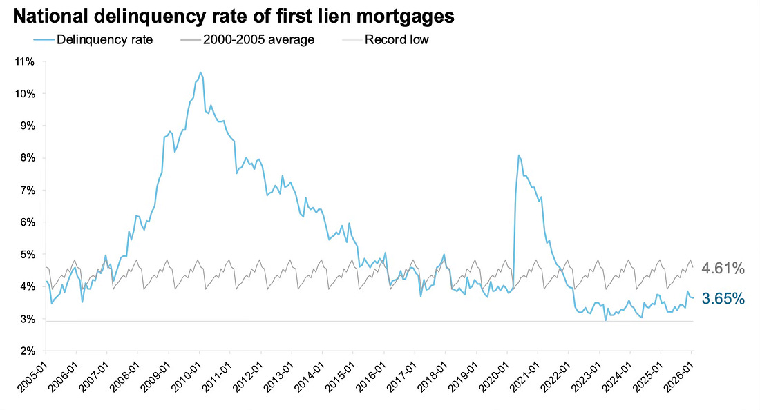 - The national delinquency rate dipped 3 basis points in January to 3.65% and is now 15 basis points below the pre-pandemic January 2020 benchmark