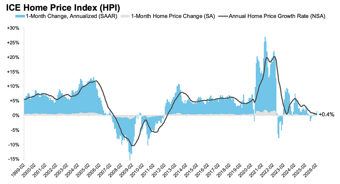 Here is the year-over-year in house prices according to the ICE Home Price Index (HPI). The ICE HPI is a repeat sales index. ICE reports the median price change of the repeat sales. The index was up 0.4% year-over-year in February.