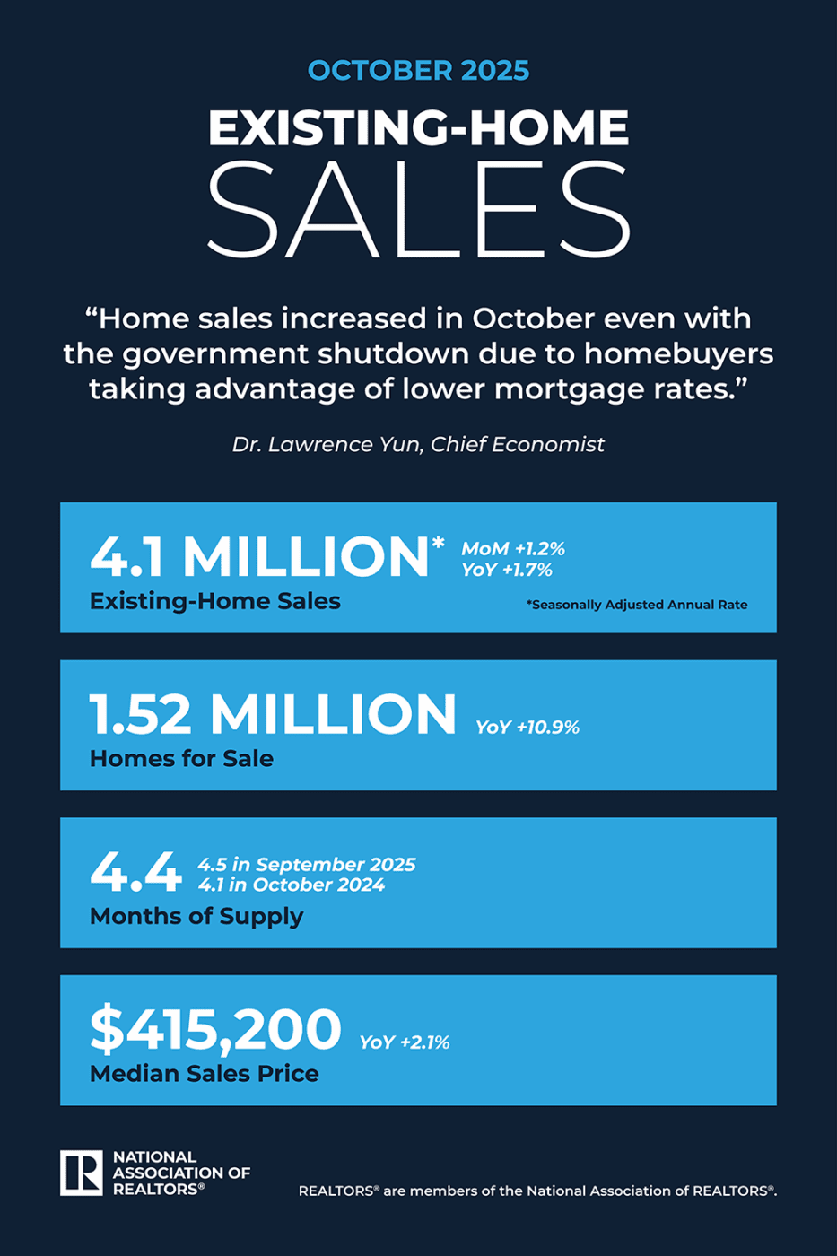 - 4.4-month supply of unsold inventory, down from 4.5 months in September and up from 4.1 months in October 2024.