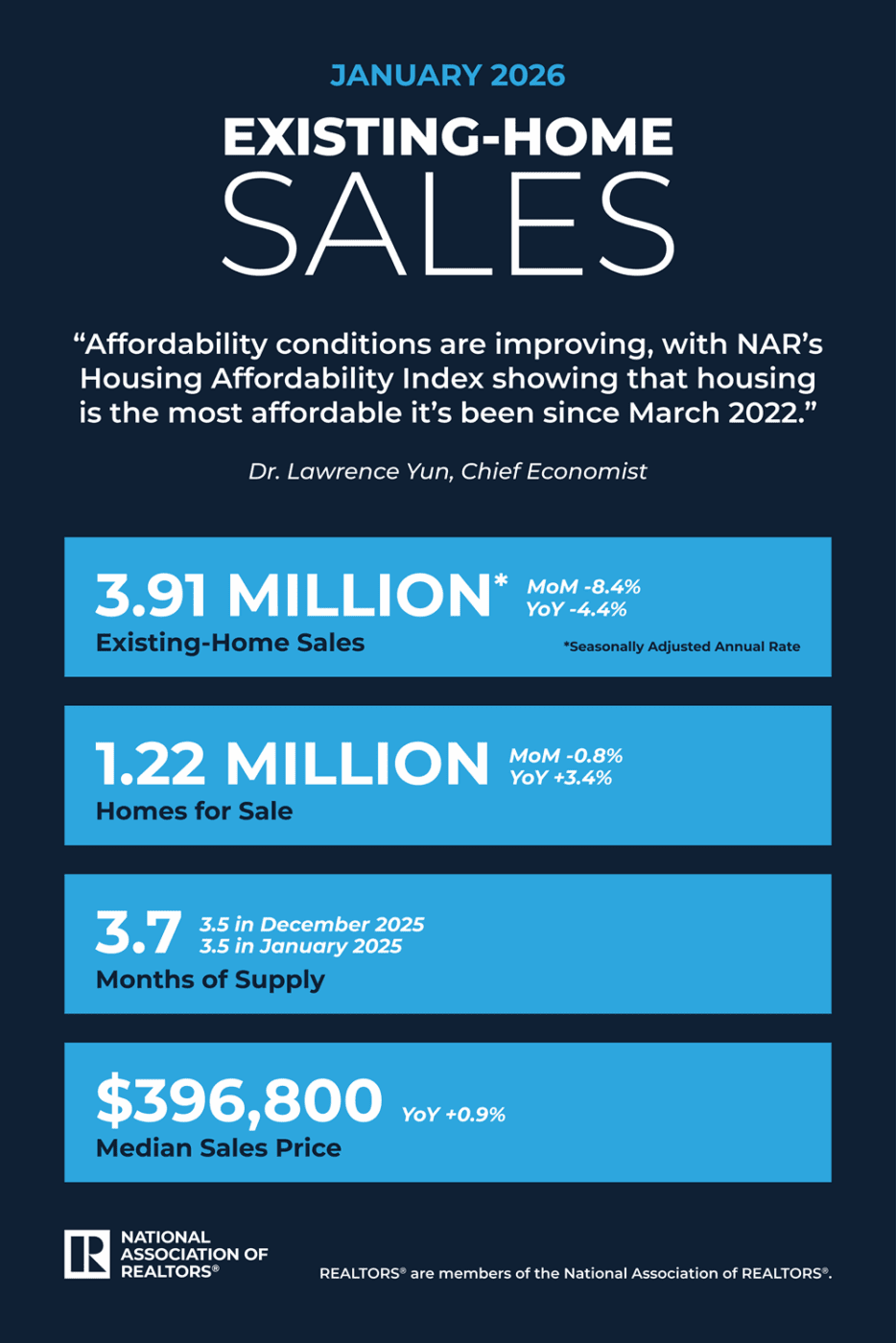 Existing-home sales decreased by 8.4% in January, according to the National Association of REALTORS® Existing-Home Sales Report. The report provides the real estate ecosystem—including agents, homebuyers and sellers—with data on the level of home sales, price, and inventory.