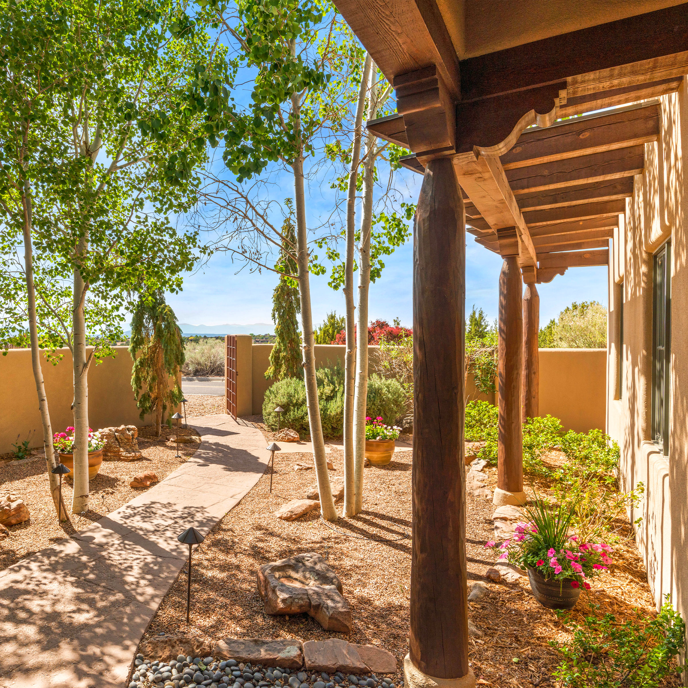 A beautiful, private clubhouse offers Zocalo residents a center point of recreation and connection. Legorreta created a dramatic space that serves as a showcase for Zocalo’s signature design. The 5,700 square-foot clubhouse offers a grand foyer entry with fireplace, fitness center, swimming pool, club room, conference room and catering kitchen. There is a beautiful fountain patio and a scenic walking trail. Located in the foothills of the beautiful Sangre de Cristo Mountains on Santa Fe’s prestigious north side, Zocalo offers a convenient, easy lifestyle with close proximity to the best of Santa Fe. Zocalo is just minutes to downtown Santa Fe’s historic plaza, world-famous art galleries, renowned culinary cuisine, shopping and museums. The Santa Fe Opera, Santa Fe Ski Basin and recreation complexes are minutes away. National forest and wilderness areas offer numerous walking, hiking, and biking trails all within a short drive from Zocalo.