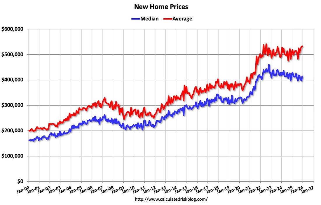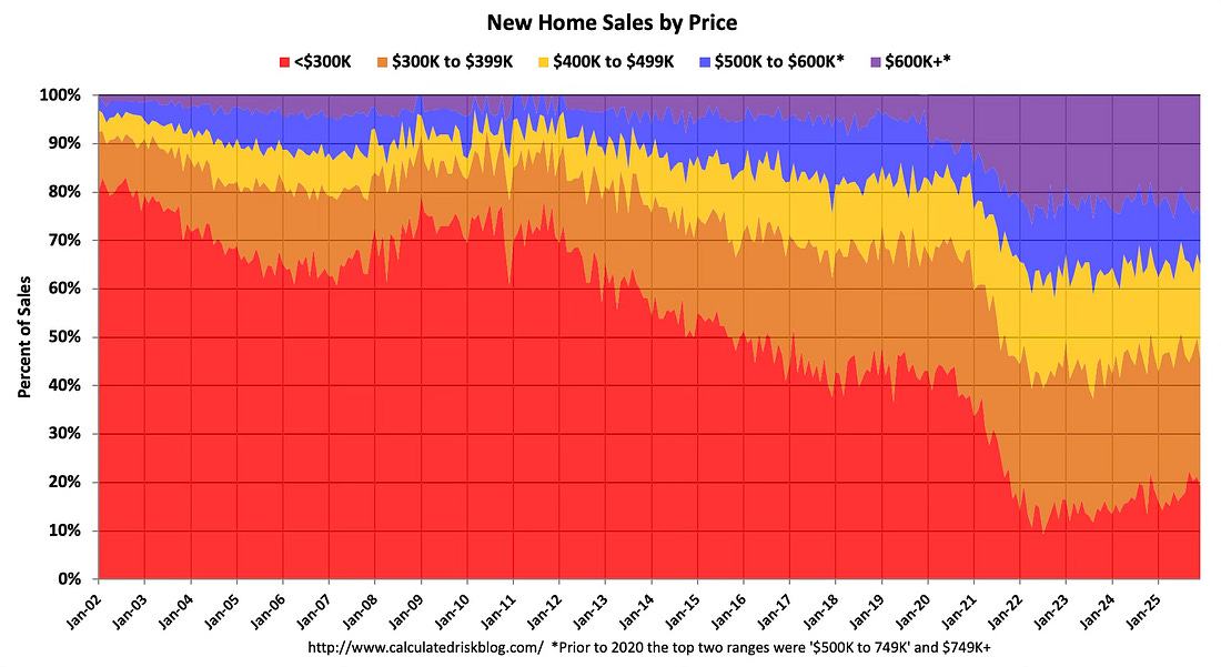 About 19% of new homes sold were under $300K in December 2025. This is up from a low of 9.3% in July 2022, but down from around 80% in 2002. In general, the under $300K bracket is going away (inflation has pushed prices higher).