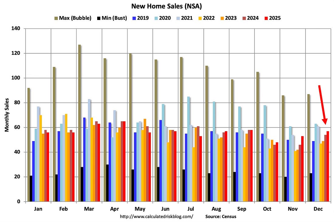 In December 2025 (red column), 57 thousand new homes were sold (NSA). Last year, 54 thousand homes were sold in December. The all-time high for December was 87 thousand in 2005, and the all-time low for December was 23 thousand in 2010.