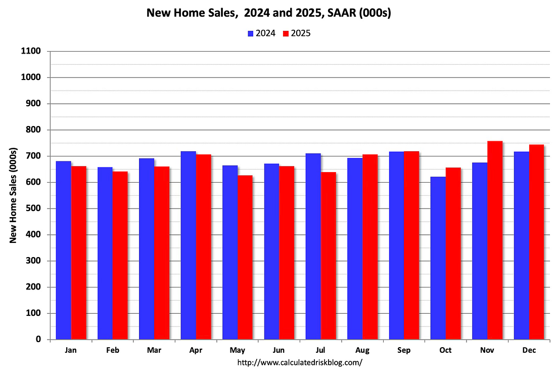 Sales of new single-family houses in December 2025 were at a seasonally-adjusted annual rate of 745,000, according to estimates released jointly today by the U.S. Census Bureau and the Department of Housing and Urban Development. This is 1.7 percent below the November 2025 rate of 758,000, and is 3.8 percent above the December 2024 rate of 718,000.
