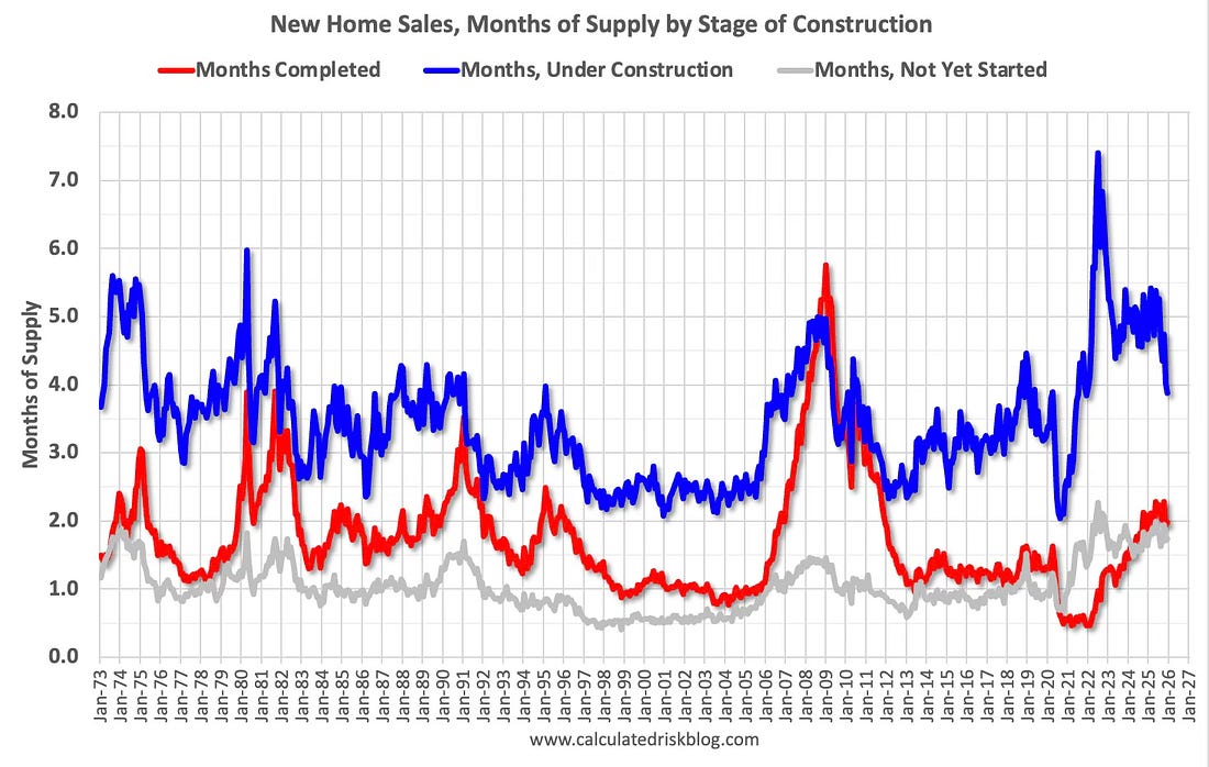 This represents a supply of 7.6 months at the current sales rate. The months’ supply is 1.3 percent below the November 2025 estimate of 7.7 months, and is 7.3 percent below the December 2024 estimate of 8.2 months.