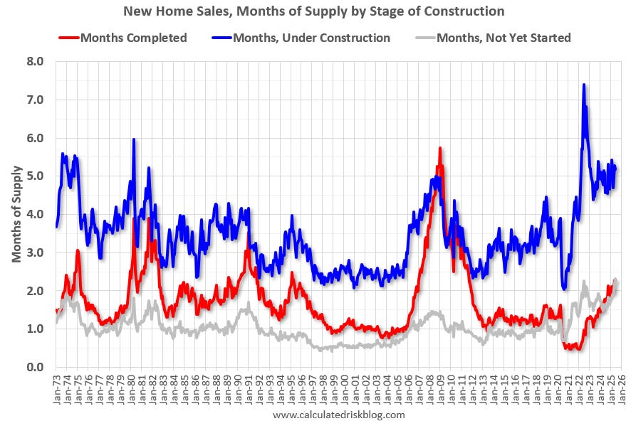 The inventory of new homes under construction is at 5.2 months (blue line). This has declined from 7.4 months in July 2022 but is still a much larger than normal number of homes under construction.