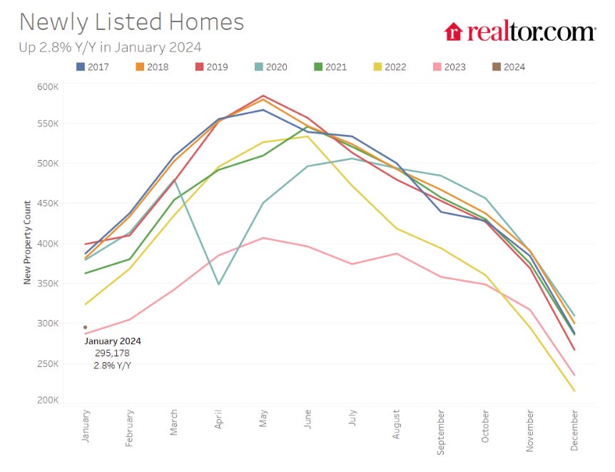 Here is a graph of new listing from Realtor.com’s January 2024 Monthly Housing Market Trends Report showing new listings were up 2.8% year-over-year in January. This is just a slight increase from the record low for January set in 2023.From Realtor.com: