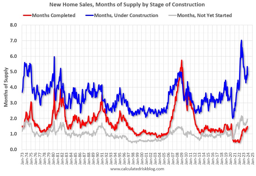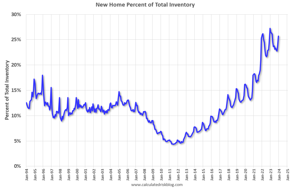 It took a number of years following the housing bust for new home inventory to return to the pre-bubble percent of total inventory. Then, with the pandemic, existing home inventory collapsed and now the percent of new homes is 25.7% of the total for sale inventory, down from 27.2% in December 2022. The percent of new homes of total inventory should decline this year as existing home inventory increases in 2024.