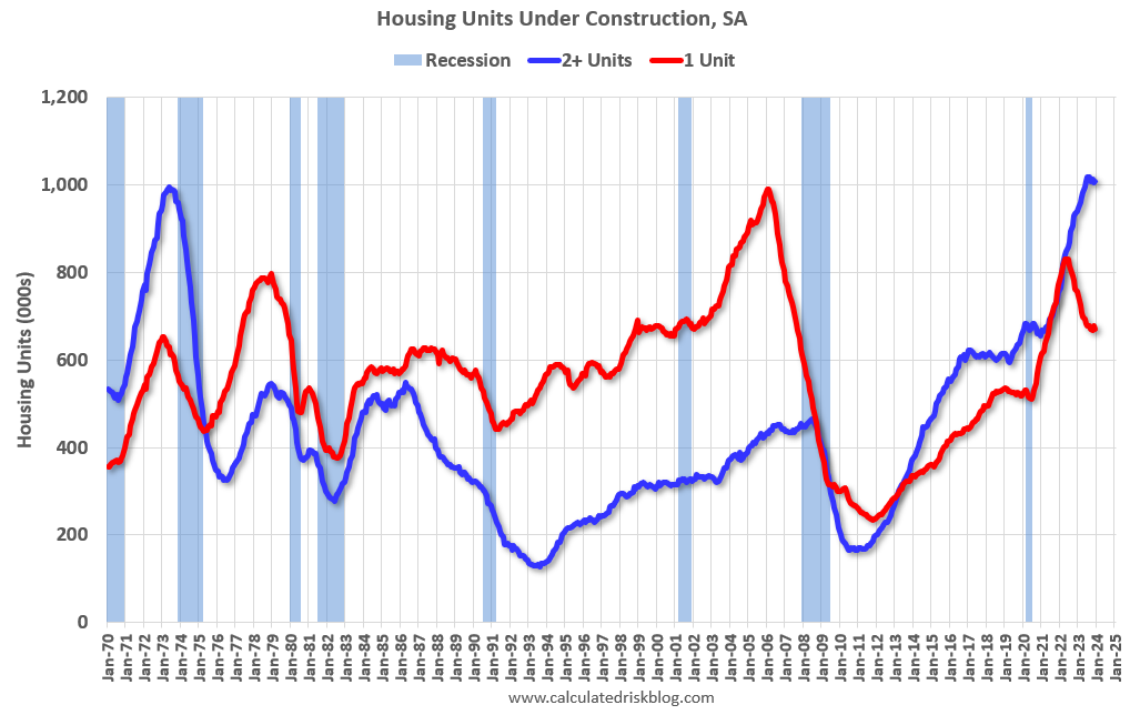 Red is single family units. Currently there are 671 thousand single family units (red) under construction (SA). This was down in December compared to November, and 160 thousand below the recent peak in May 2022. Blue is for 2+ units. Currently there are 1,008 thousand multi-family units under construction. This is slightly below the record set in July 2023 of 1,018 thousand.
