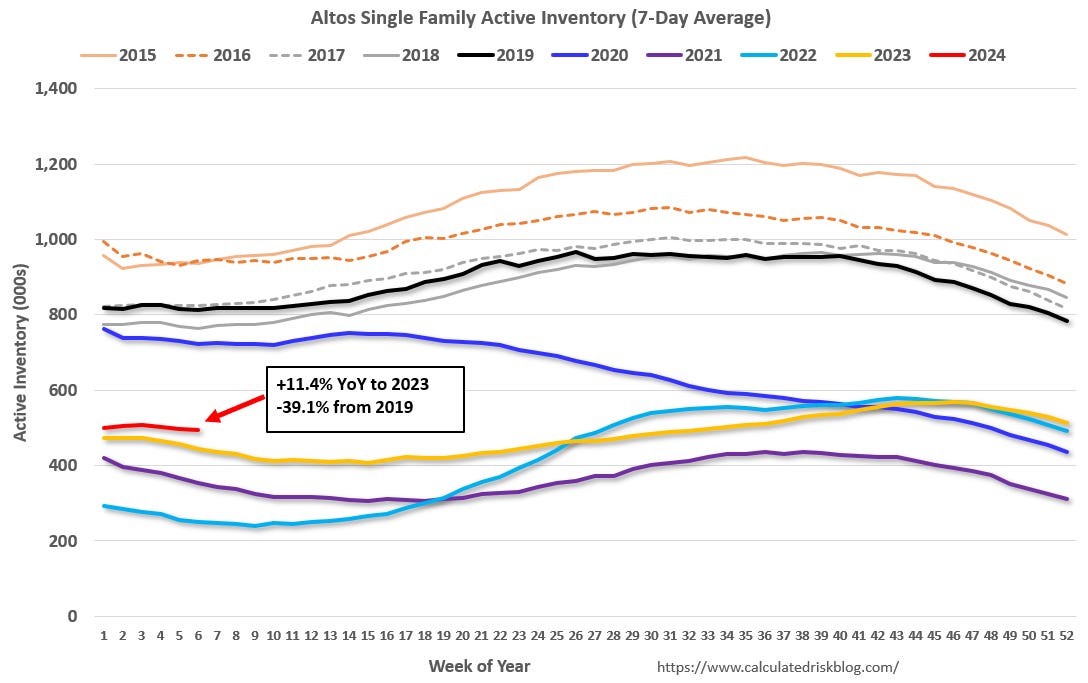The following graph shows the seasonal pattern for active single-family inventory since 2015 through February 9, 2024, from Altos Research. The red line is for 2024. The black line is for 2019.