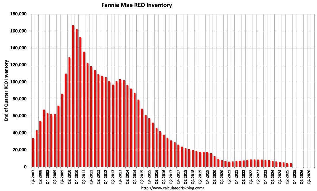 The dollar value of 1-4 family residential Real Estate Owned (REOs, foreclosure houses) was up 24% YOY from $765 million in Q3 2024 to $951 million in Q3 2025. This is still historically very low, but increasing.