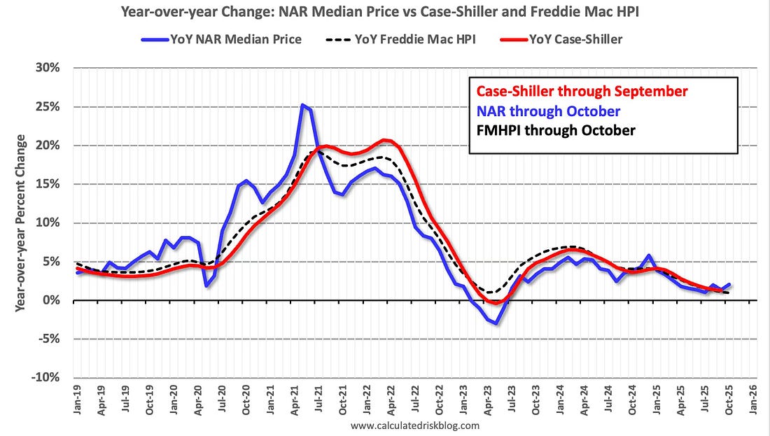 Other measures of house prices suggest prices will be up about the same YoY in the October Case-Shiller index as in the September report. The NAR reported median prices were up 2.1% YoY in October, up from 1.4% YoY in September. (Note that median prices are impacted by the mix).