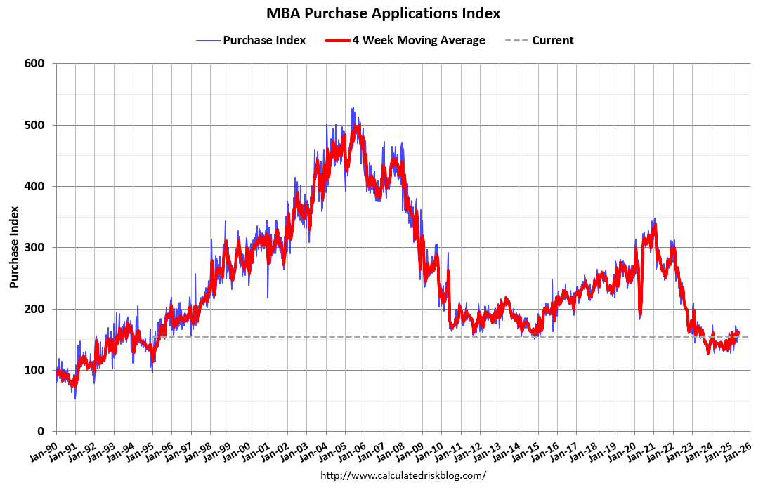 Here is a graph showing the MBA mortgage purchase index released last week. Purchase application activity is up from the lows in late October 2023 and is 3% above the lowest levels during the housing bust.
