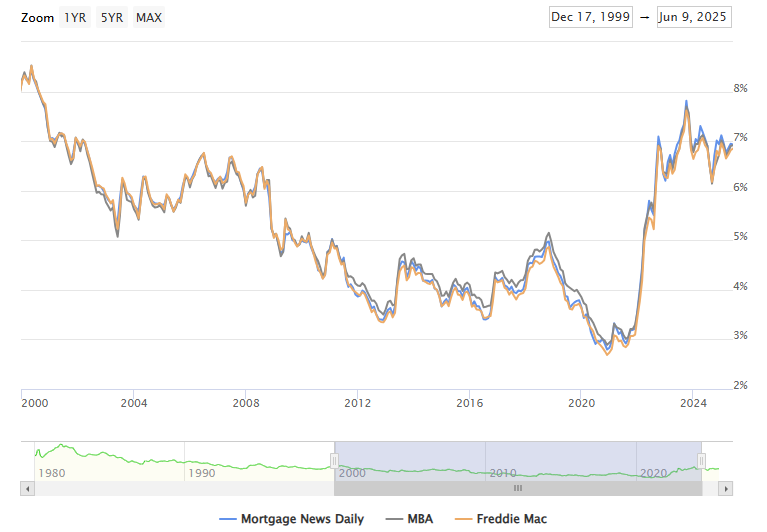 The following graph from MortgageNewsDaily.com shows mortgage rates since January 1, 2000. 30-year mortgage rates were at 6.95% on June 9th.