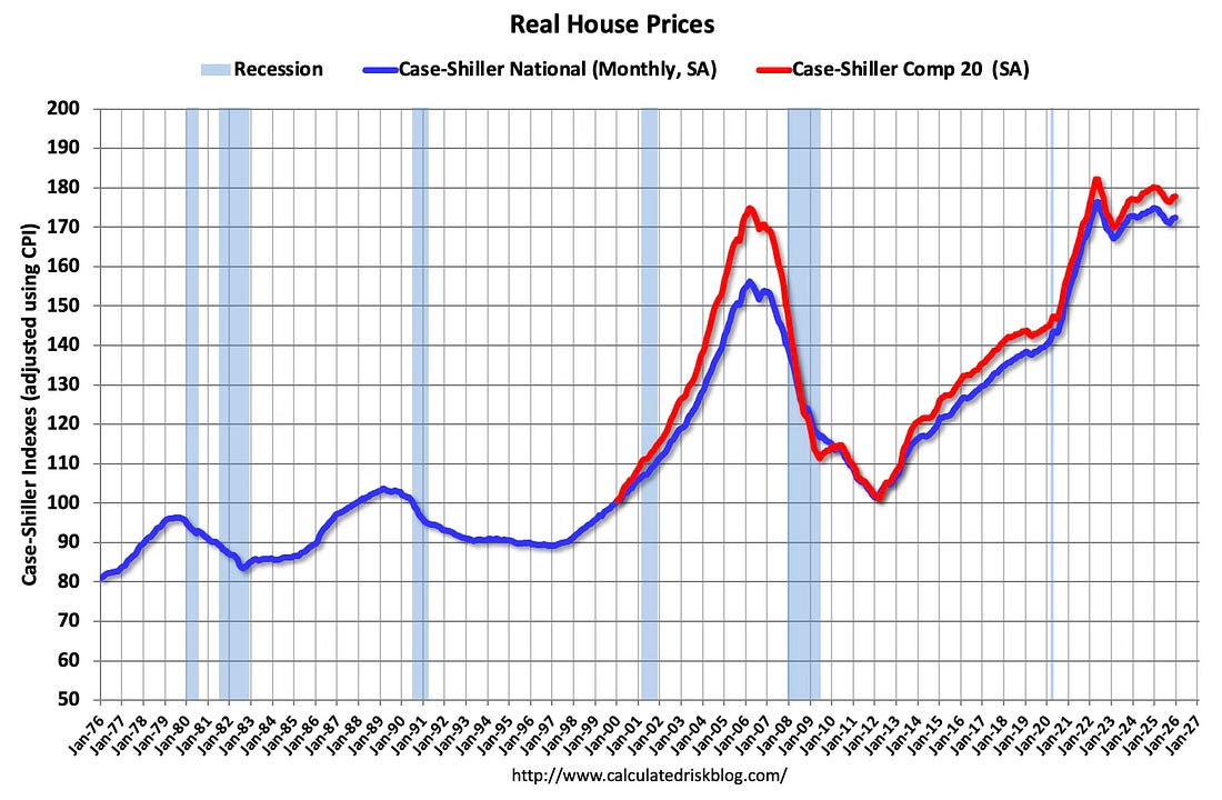 The December Case-Shiller index was a 3-month average of closing prices in October, November and December. October closing prices include some contracts signed in August. So, not only is the year-over-year change trending down, but there is a significant lag to this data.