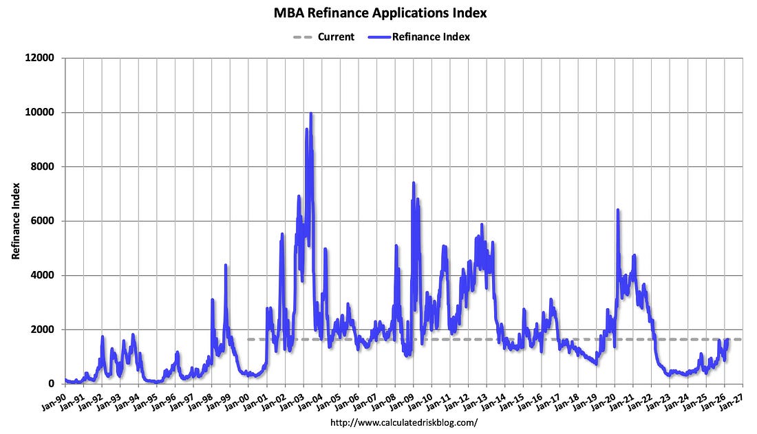 And the next graph shows the refinance index since 1990. Refinance activity is still very low but picked up a little with lower mortgage rates.