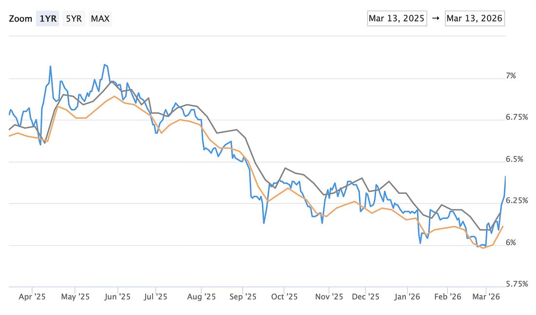 The following graph from MortgageNewsDaily.com shows mortgage rates over the last year. 30-year mortgage rates were at 6.41% on March 13th.