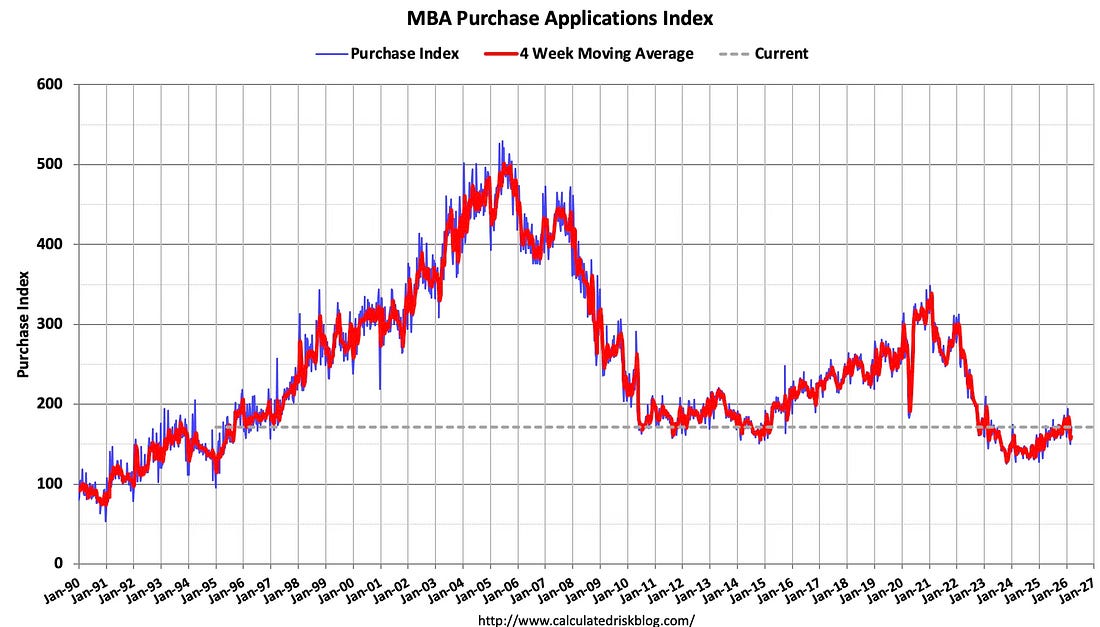 Here is a graph showing the MBA mortgage purchase index released last week. Purchase application activity is up from the lows in late October 2023 but near the lowest levels during the housing bust.