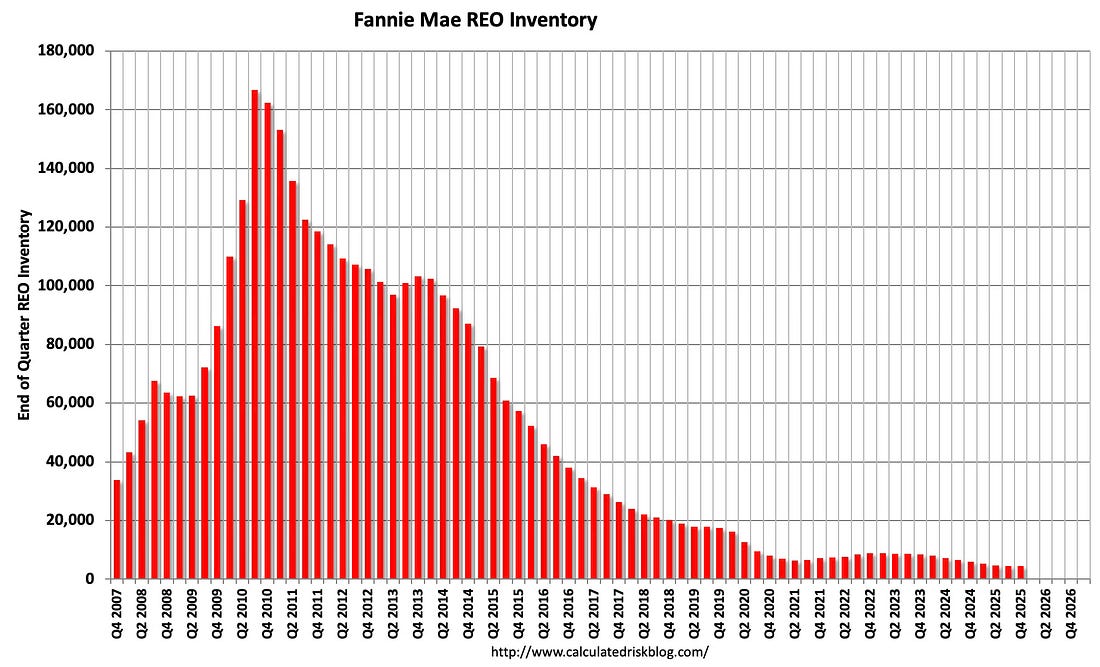 Fannie Mae reported the number of REOs decreased to 4,519 at the end of Q4 2025, up slightly from 4,496 at the end of the previous quarter, and down 23% year-over-year from 5,895 in Q4 2024. Here is a graph of Fannie Real Estate Owned (REO).