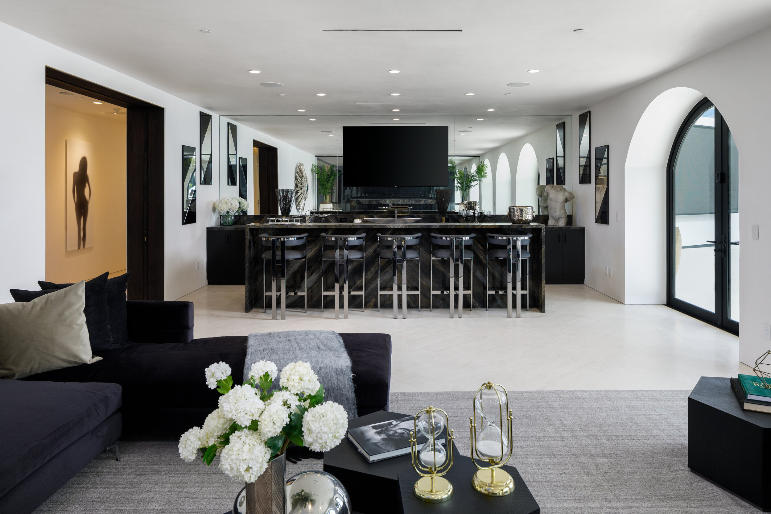 Every inch oozes extravagance and luxury — a private gateway with a waterfall leads to the house while the interior has an open floor plan and floor-to-ceiling doors and windows, along with features like an arabescato orobico marble fireplace and accents made from Italian marble. A palette of whites and other neutral colors is offset with modern black accents.