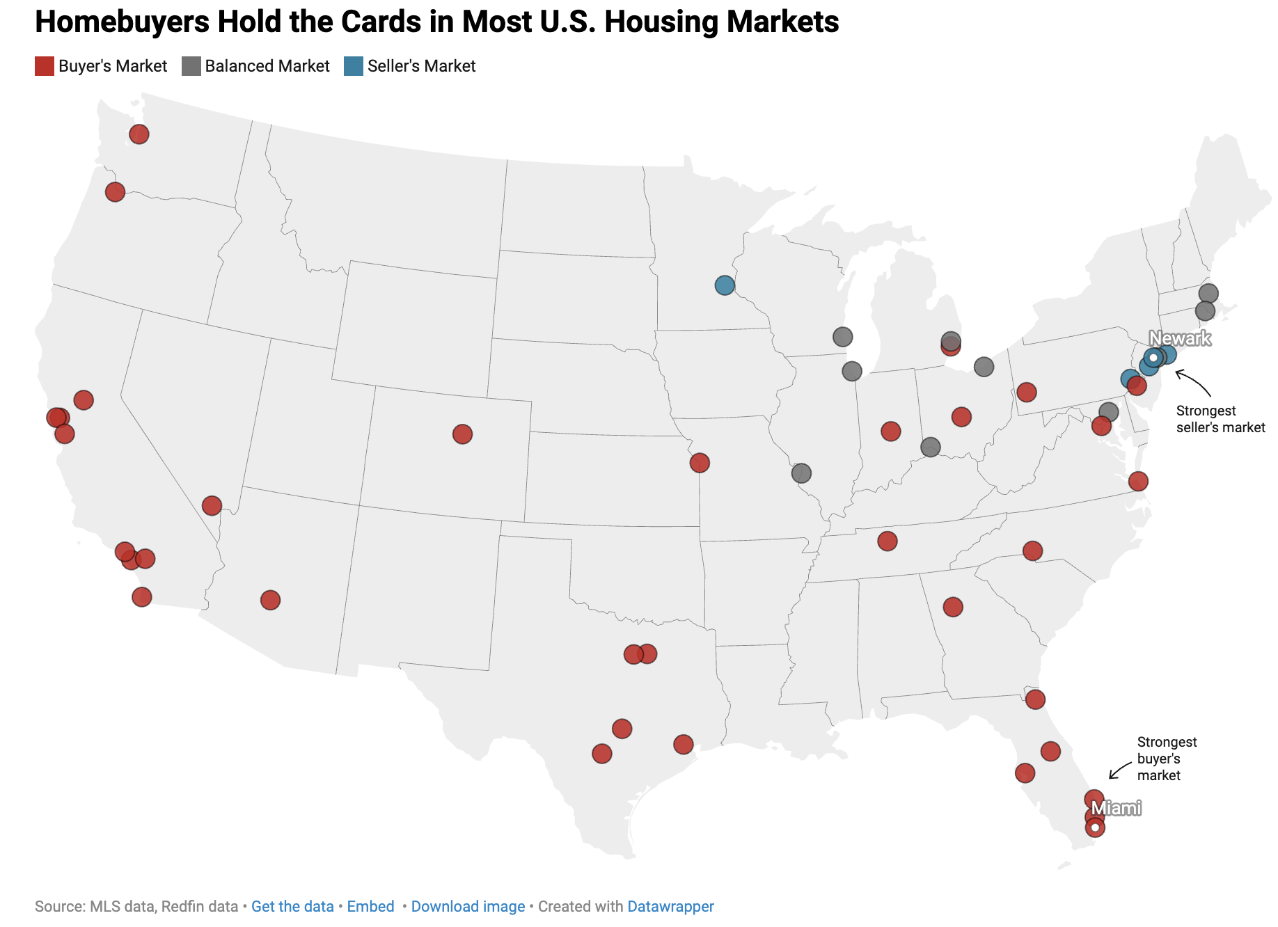 Although it’s currently a buyer’s market nationally, there are, of course, variations from market to market, Redfin’s report shows. Out of the 50 most populous markets in the U.S., 35 are currently buyer’s markets, 10 are balanced and five are seller’s markets.