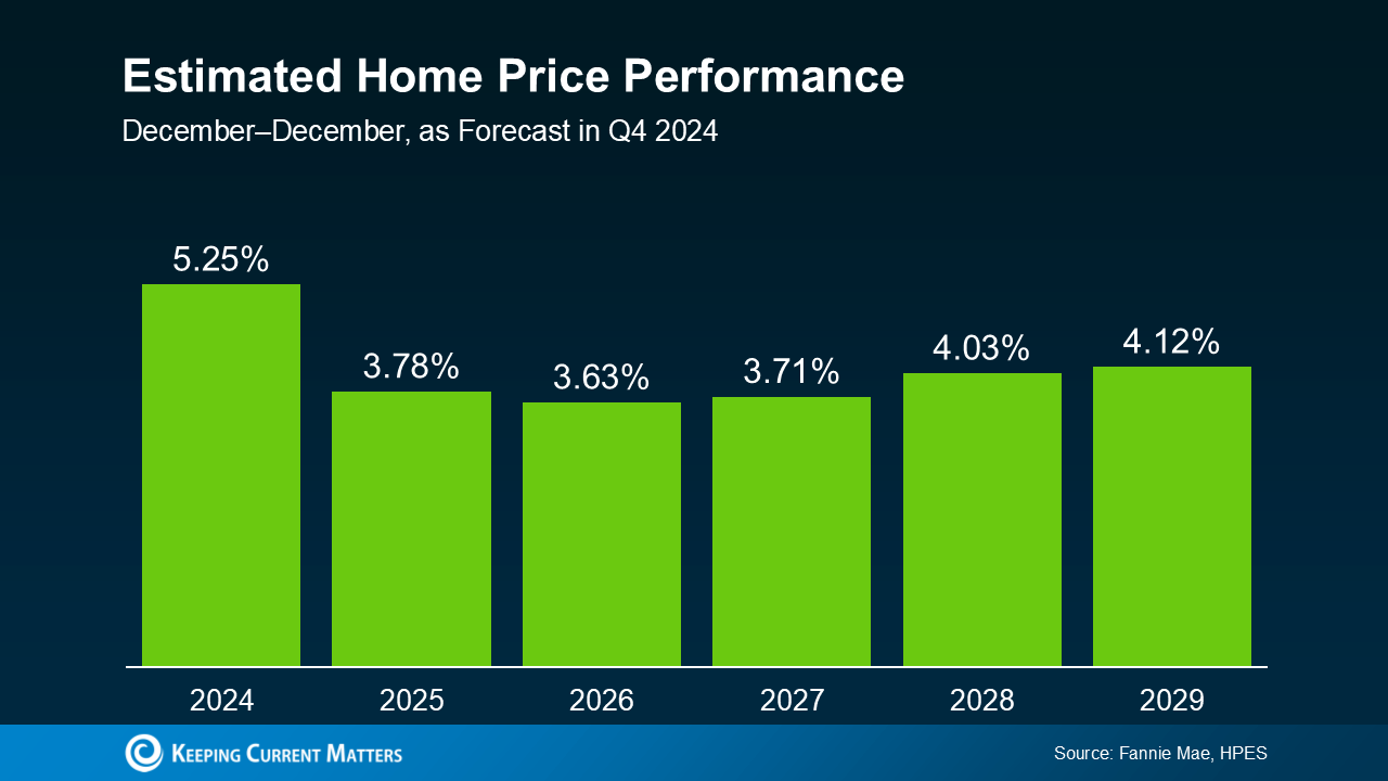 Here’s some data to break this down so you can really see the benefit of buying now versus later – if you’re able to. Each quarter, Fannie Mae releases the Home Price Expectations Survey. It asks over one hundred economists, real estate experts, and investment and market strategists what they forecast for home prices over the next five years. In the latest release, experts are projecting home prices will continue to rise through at least 2029 – just at a slower, more normal pace than they did over the past few years (see the graph below):