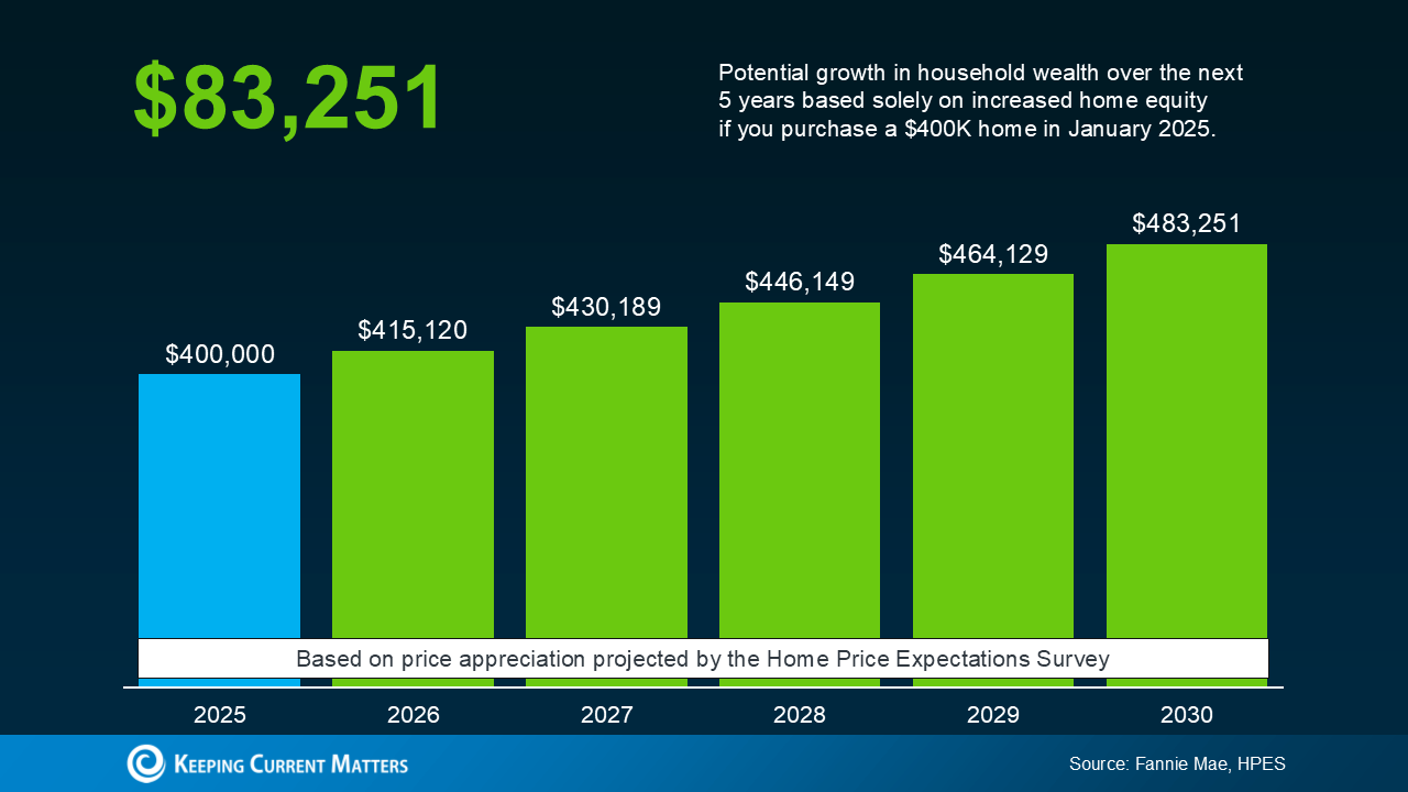 In this example, let’s say you go ahead and buy a $400,000 home this January. Based on the expert forecasts from the HPES, you could gain more than $83,000 in household wealth over the next five years. That’s not a small number. If you keep on renting, you’re losing out on this equity gain.