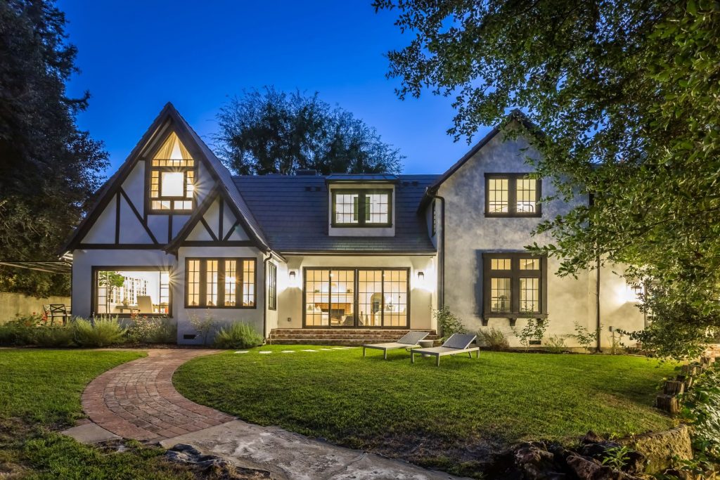 In the cool shade of mature oak trees, this delightful Tudor-inspired manor has been stylishly restored. Ideal for modern living, it features five bedrooms, open-plan living areas, a chef’s kitchen with a butler’s pantry, an office, and a family and media room. The primary bedroom is accompanied by an elegant bath and a spacious windowed closet tucked beneath the beamed pitched ceiling. Pathways connect grassy lawn, a playground and playhouse, the guesthouse, the pool, and a “grotto” with an outdoor fireplace.