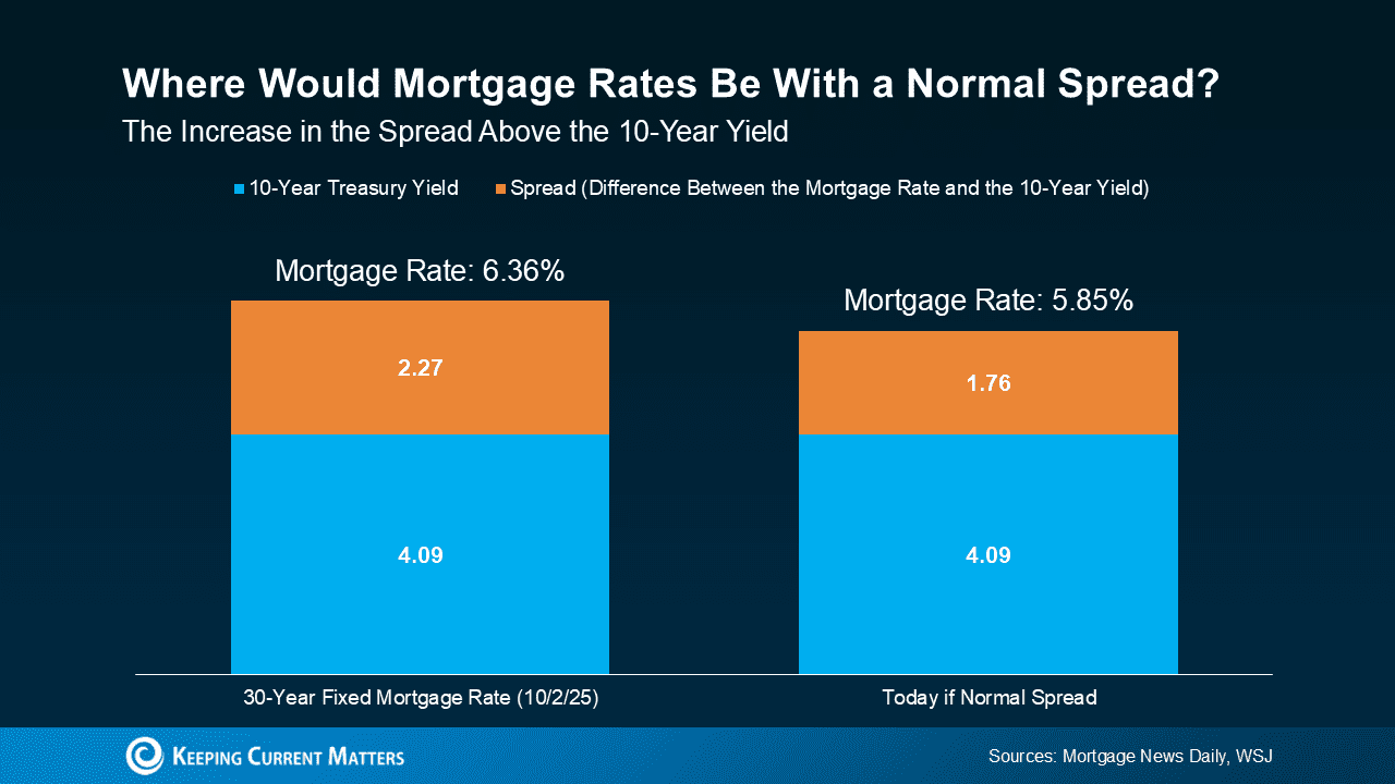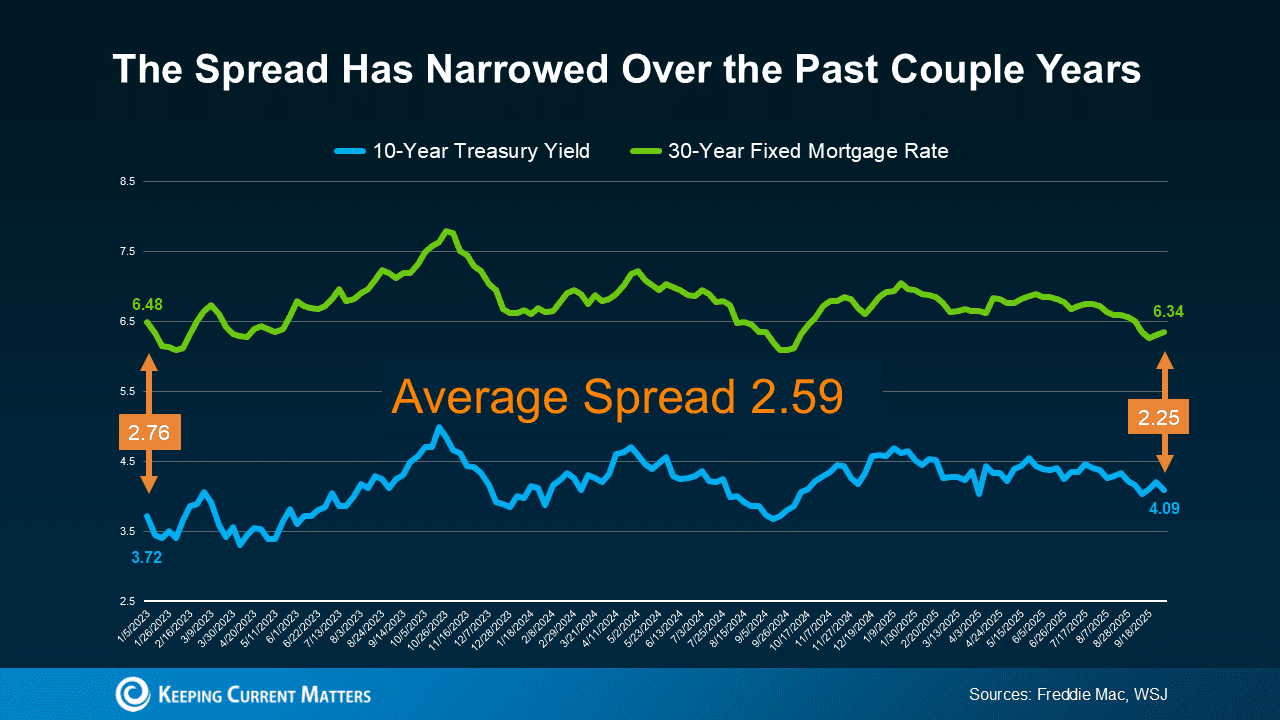 Over the past couple of years, though, that spread has been much wider than normal. Why? Think of the spread as a measure of fear in the market. When there’s lingering uncertainty in the economy, the gap widens beyond its usual norm. That’s one of the reasons why mortgage rates have been unusually high over the past few years.
